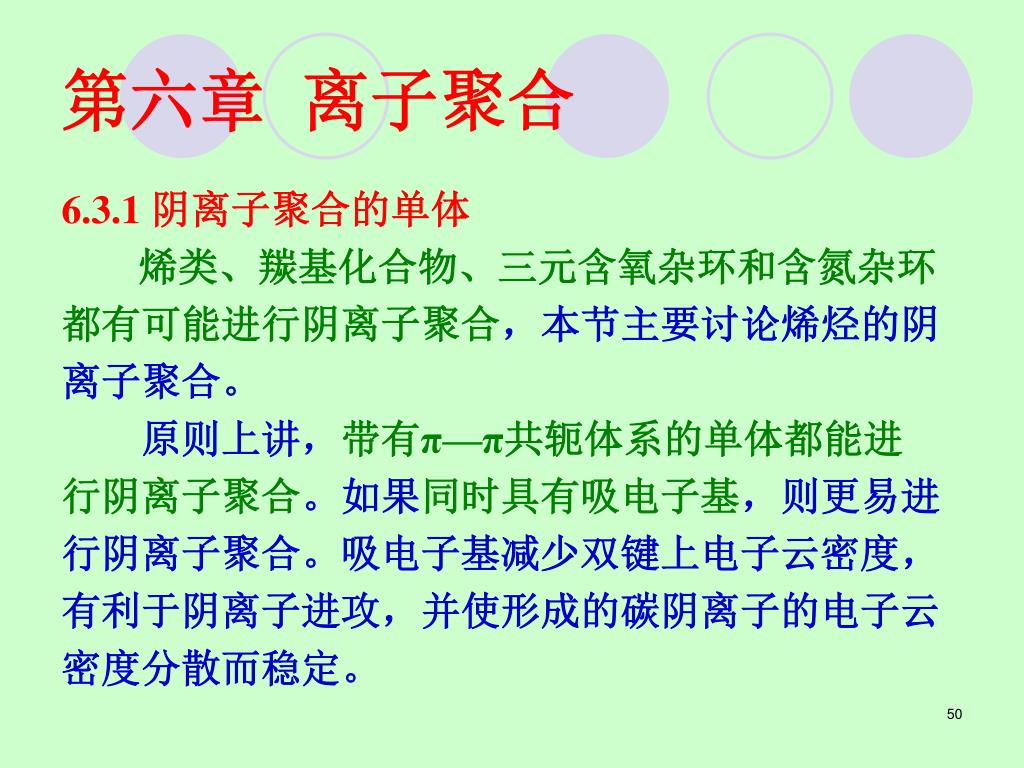 第六章 离子聚合 6.3.1 阴离子聚合的单体 烯类、羰基化合物、三元含氧杂环和含氮杂环 都有可能进行阴离子聚合,本节主要讨论烯烃的阴 离子聚合。 原则上讲,带有π—π共轭体系的单体都能进 行阴离子聚合。如果同时具有吸电子基,则更易进 行阴离子聚合。吸电子基减少双键上电子云密度, 有利于阴离子进攻,并使形成的碳阴离子的电子云 密度分散而稳定。