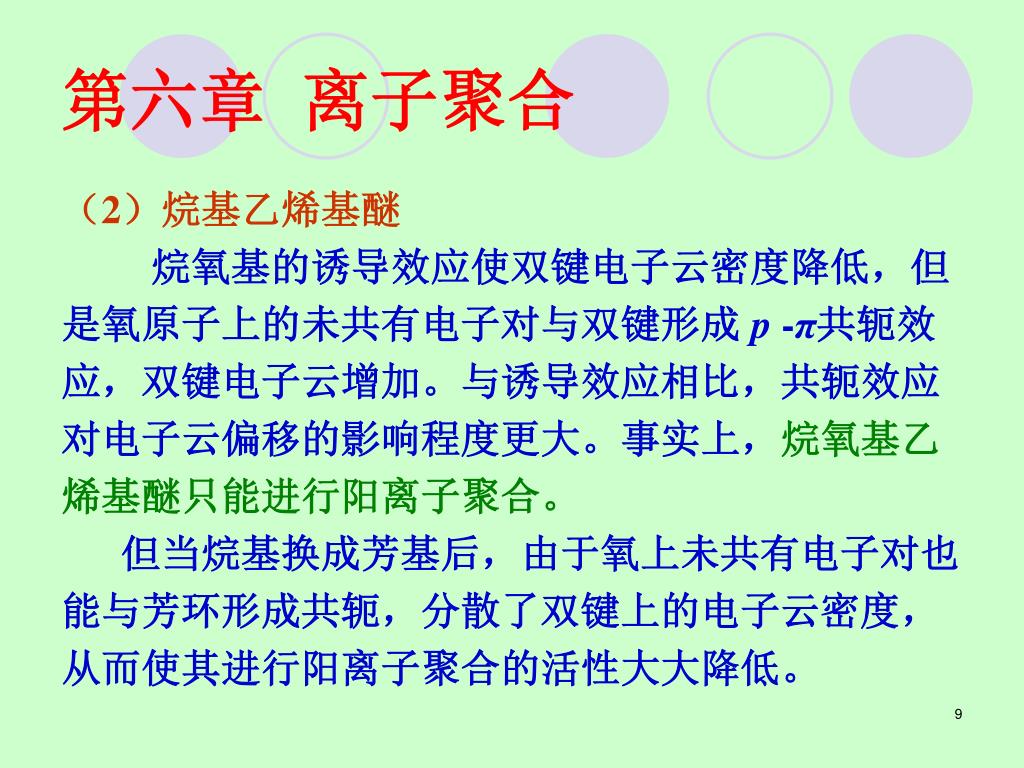 第六章 离子聚合 (2)烷基乙烯基醚 烷氧基的诱导效应使双键电子云密度降低,但 是氧原子上的未共有电子对与双键形成 p -π共轭效 应,双键电子云增加。与诱导效应相比,共轭效应 对电子云偏移的影响程度更大。事实上,烷氧基乙 烯基醚只能进行阳离子聚合。 但当烷基换成芳基后,由于氧上未共有电子对也 能与芳环形成共轭,分散了双键上的电子云密度, 从而使其进行阳离子聚合的活性大大降低。