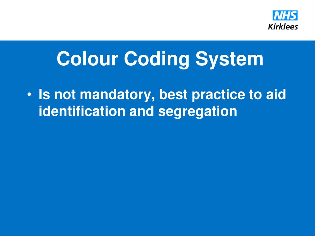Colour Coding System • Is not mandatory, best practice to aid identification and segregation