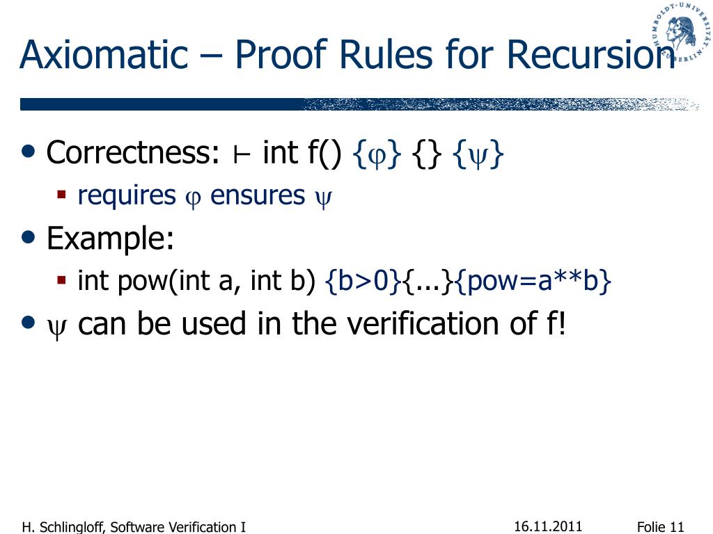 Axiomatic – Proof Rules for Recursion • Correctness: ⊢ int f() {} {} {} • requires ensures • Example: • int pow(int a, int b){b>0}{...}{pow=a**b} • can be used in the verification of f!