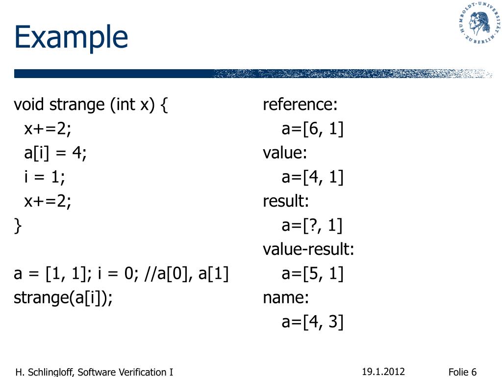 Example void strange (int x) { x+=2; a[i] = 4; i = 1; x+=2; } a = [1, 1]; i = 0; //a[0], a[1] strange(a[i]); reference: a=[6, 1] value: a=[4, 1] result: a=[?, 1] value-result: a=[5, 1] name: a=[4, 3]
