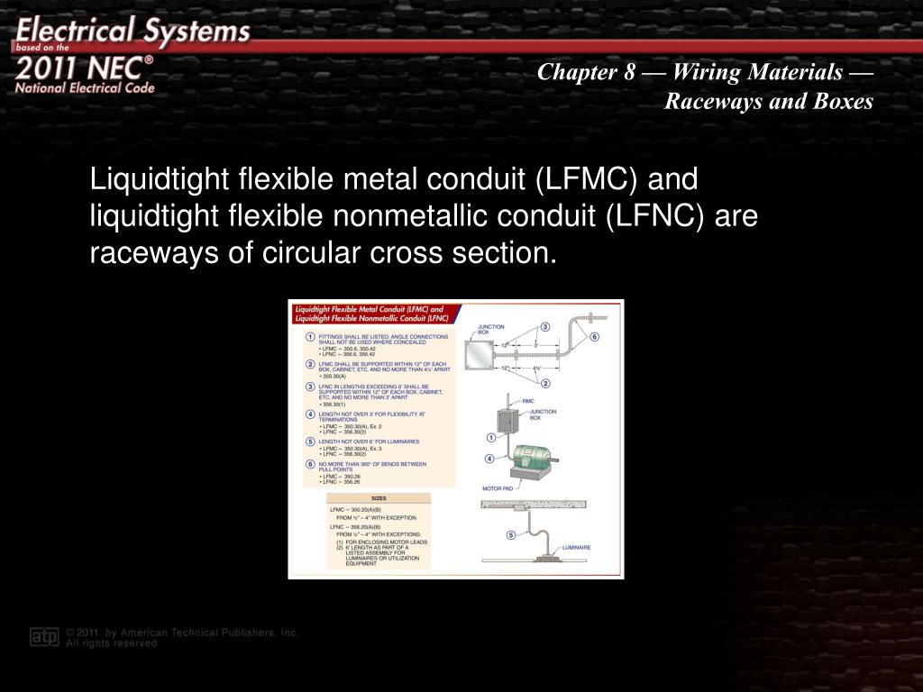 Liquidtight flexible metal conduit (LFMC) and liquidtight flexible nonmetallic conduit (LFNC) are raceways of circular cross section.