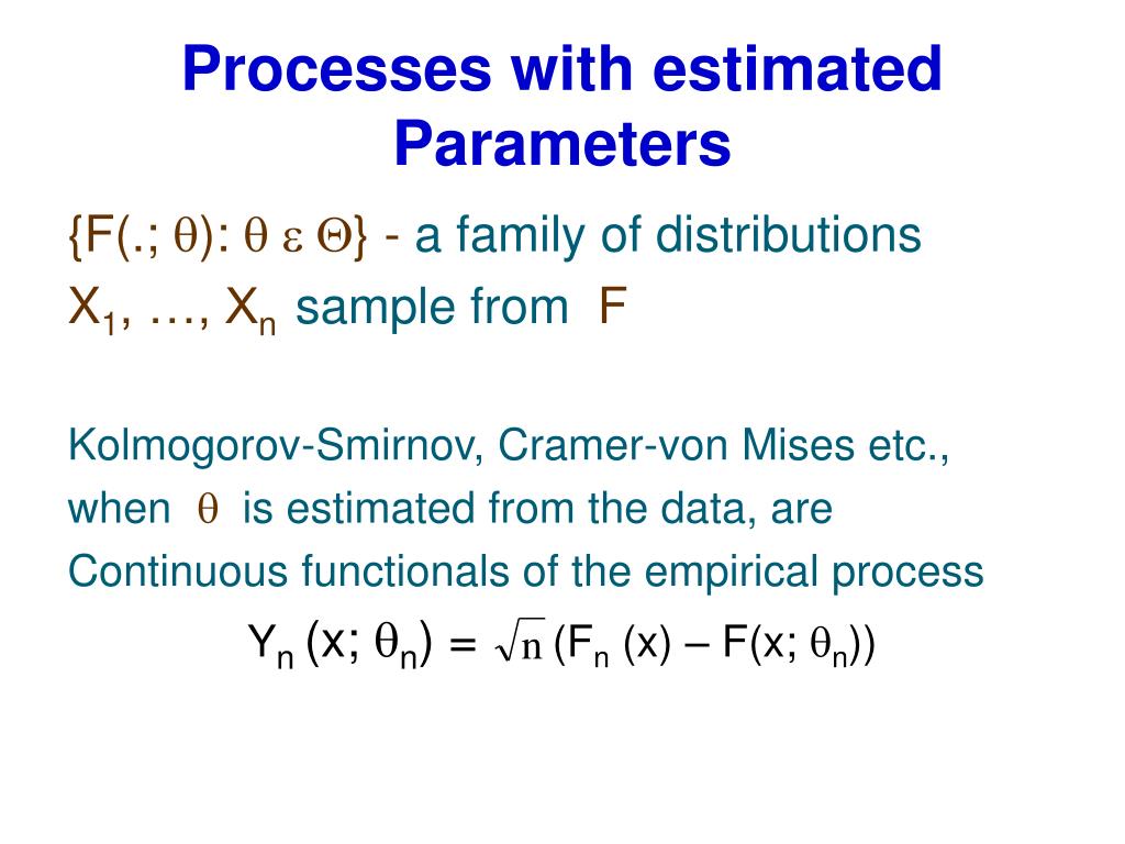 Processes with estimated Parameters {F(.; q): q e Q} - a family of distributions X1, …, Xn sample from F Kolmogorov-Smirnov, Cramer-von Mises etc., when q is estimated from the data, are Continuous functionals of the empirical process Yn (x; qn) = (Fn (x) – F(x; qn))