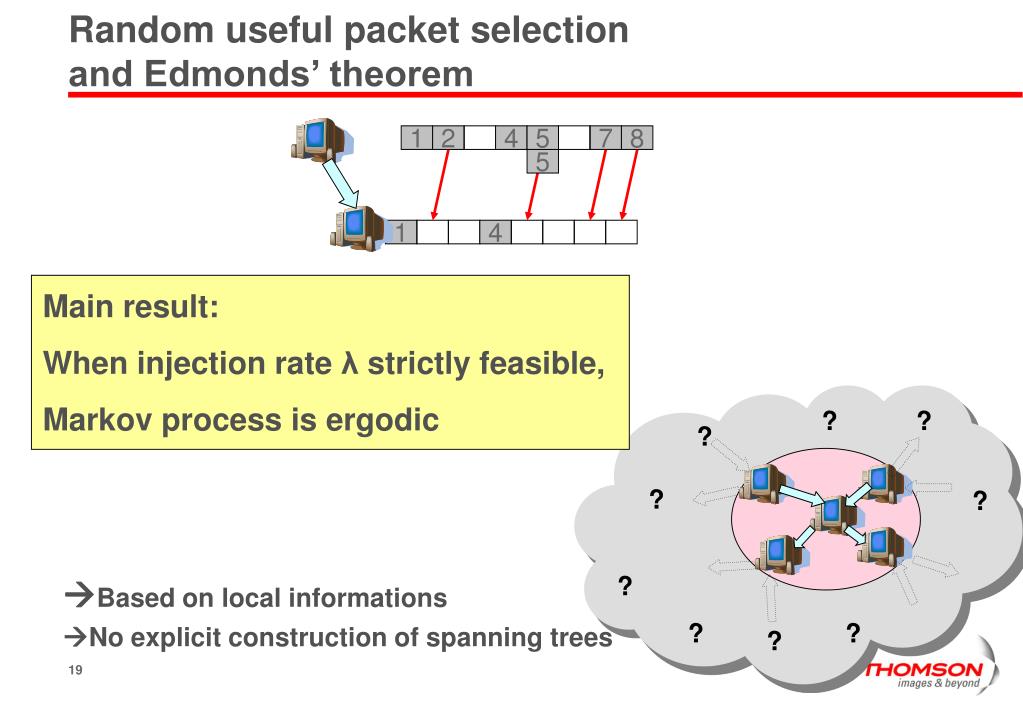 Random useful packet selection and Edmonds’ theorem 1 2 4 5 7 8 Based on local informations No explicit construction of spanning trees 5 1 4 Main result: When injection rate λ strictly feasible, Markov process is ergodic ? ? ? ? ? ? ? ? ?