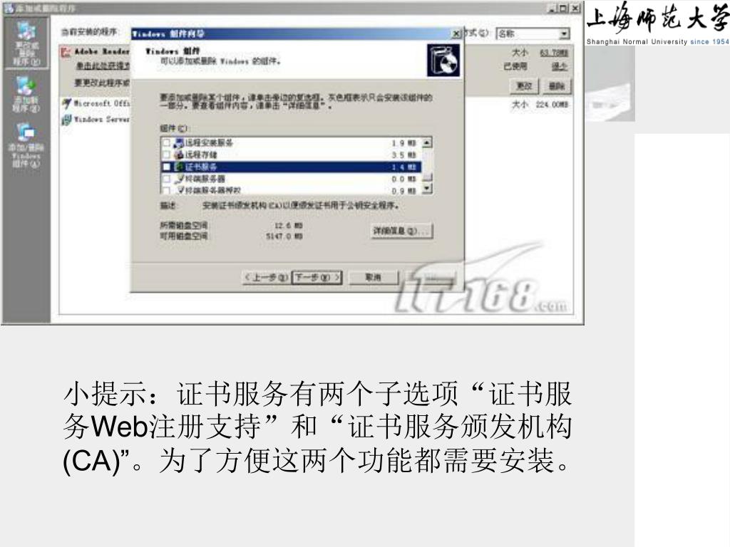 小提示:证书服务有两个子选项“证书服务Web注册支持”和“证书服务颁发机构(CA)”。为了方便这两个功能都需要安装。小提示:证书服务有两个子选项“证书服务Web注册支持”和“证书服务颁发机构(CA)”。为了方便这两个功能都需要安装。