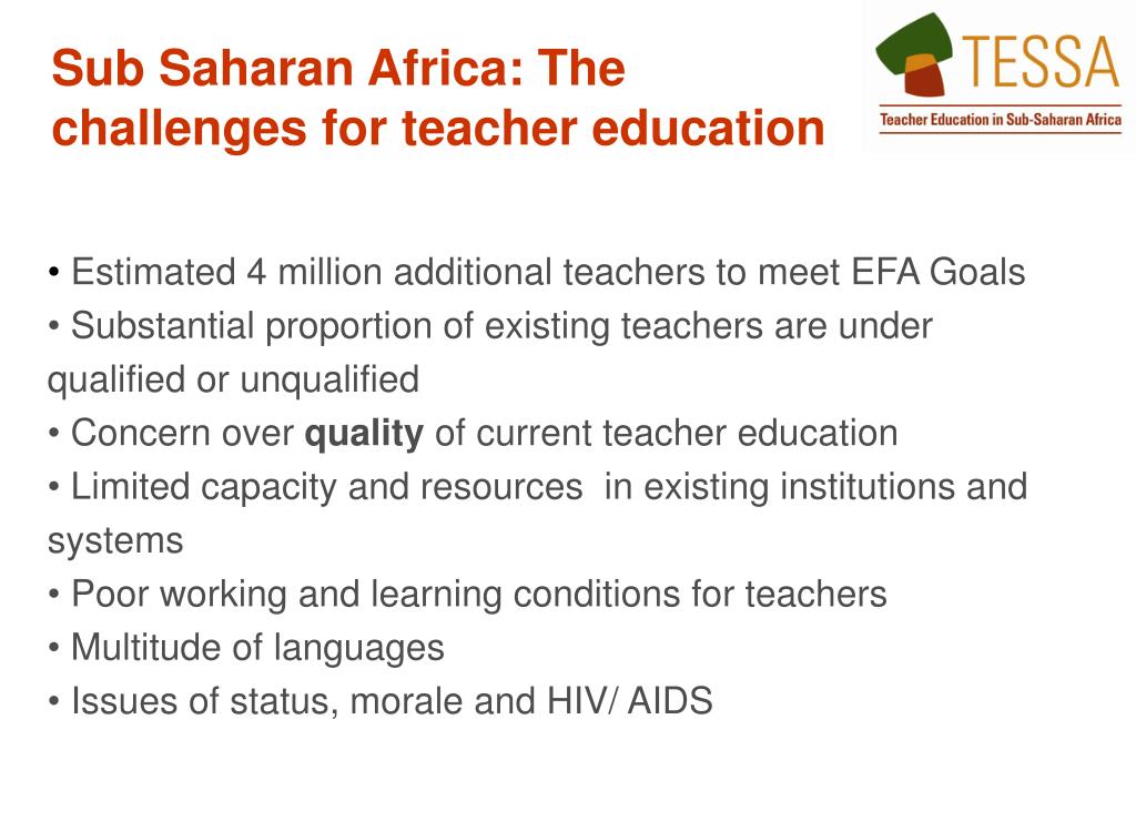 Sub Saharan Africa: The challenges for teacher education • Estimated 4 million additional teachers to meet EFA Goals • Substantial proportion of existing teachers are under qualified or unqualified • Concern over quality of current teacher education • Limited capacity and resources in existing institutions and systems • Poor working and learning conditions for teachers • Multitude of languages • Issues of status, morale and HIV/ AIDS