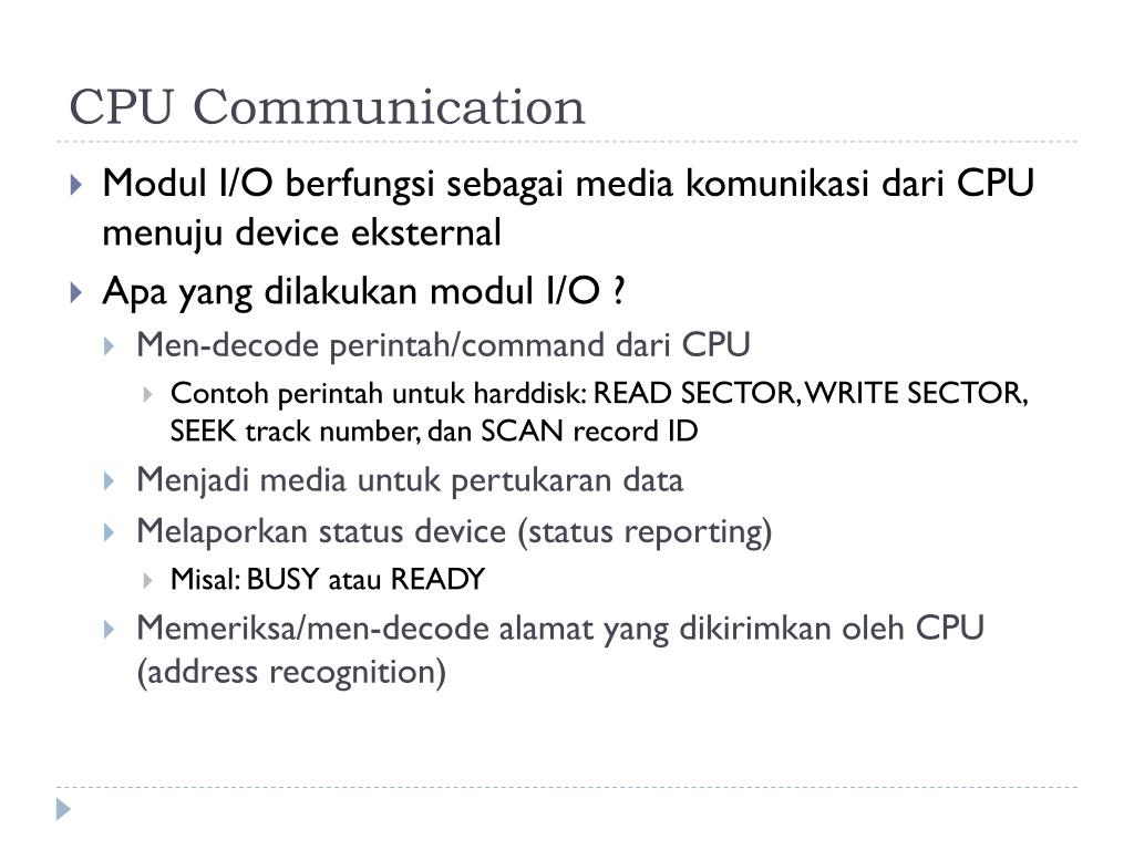 CPU Communication • Modul I/O berfungsisebagai media komunikasidariCPU menujudevice eksternal • Apayang dilakukanmodul I/O ? • Men-decode perintah/command dariCPU • Contohperintahuntukharddisk: READ SECTOR, WRITE SECTOR, SEEK track number, dan SCAN record ID • Menjadimedia untukpertukaran data • Melaporkanstatus device (status reporting) • Misal: BUSY atau READY • Memeriksa/men-decode alamatyang dikirimkanolehCPU (address recognition)