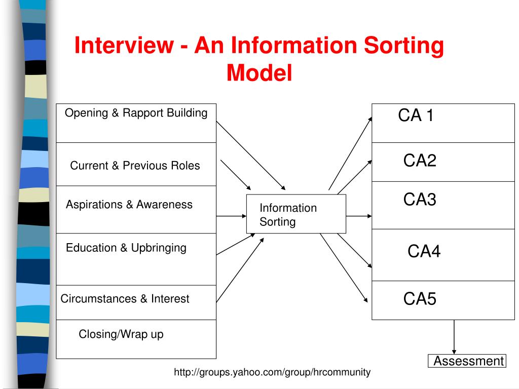 Interview - An Information Sorting Model CA 1 Opening & Rapport Building CA2 Current & Previous Roles CA3 Aspirations & Awareness Information Sorting CA4 Education & Upbringing CA5 Circumstances & Interest Closing/Wrap up Assessment http://groups.yahoo.com/group/hrcommunity