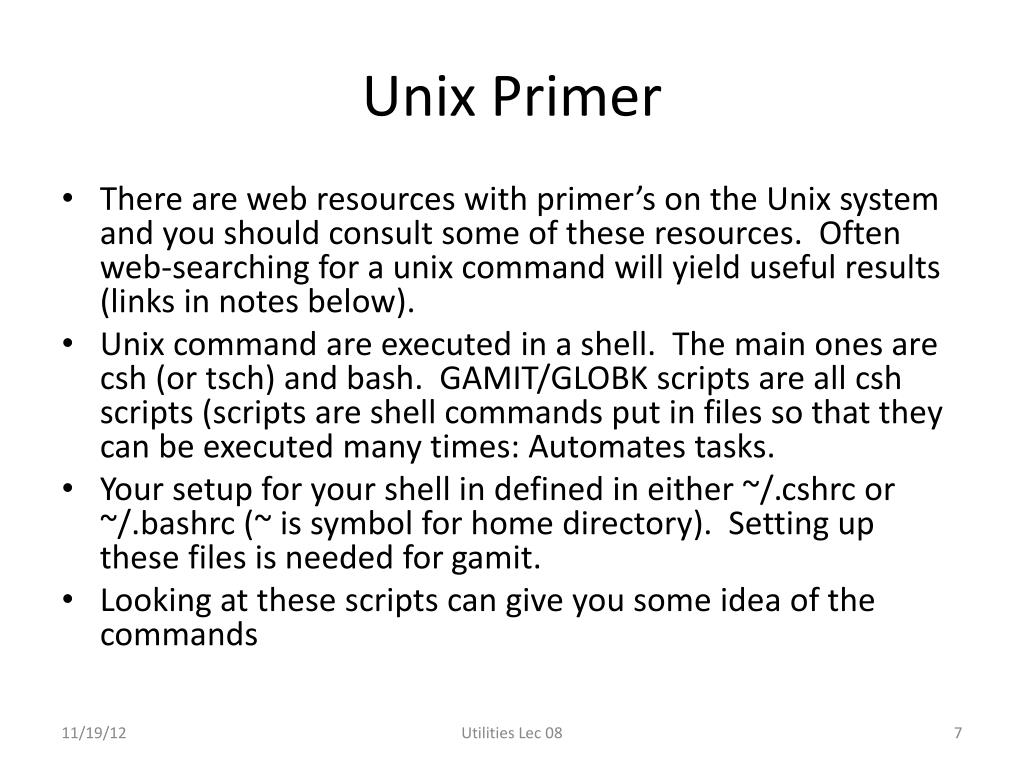 Unix Primer • There are web resources with primer’s on the Unix system and you should consult some of these resources. Often web-searching for a unix command will yield useful results (links in notes below). • Unix command are executed in a shell. The main ones are csh (or tsch) and bash. GAMIT/GLOBK scripts are all csh scripts (scripts are shell commands put in files so that they can be executed many times: Automates tasks. • Your setup for your shell in defined in either ~/.cshrc or ~/.bashrc (~ is symbol for home directory). Setting up these files is needed for gamit. • Looking at these scripts can give you some idea of the commands Utilities Lec 08
