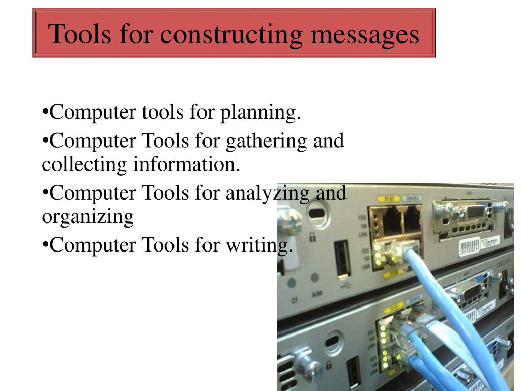 Tools for constructing messages Computer tools for planning. Computer Tools for gathering and collecting information. Computer Tools for analyzing and organizing Computer Tools for writing.