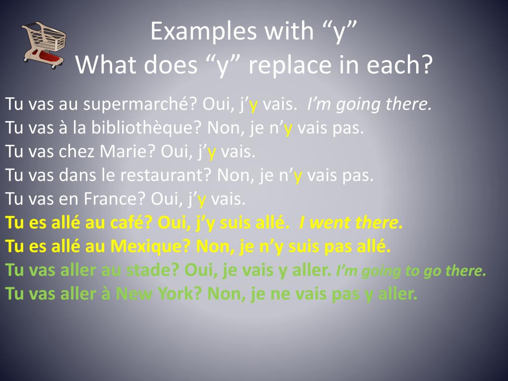 Examples with “y”What does “y” replace in each? Tu vas au supermarché? Oui, j’yvais. I’m going there. Tu vas à la bibliothèque? Non, je n’yvais pas. Tu vas chez Marie? Oui, j’yvais. Tu vas dans le restaurant? Non, je n’yvais pas. Tu vas en France? Oui, j’yvais. Tuesallé au café? Oui, j’ysuisallé. I went there. Tuesallé au Mexique? Non, je n’ysuis pas allé. Tu vas aller au stade? Oui, je vais y aller.I’m going to go there. Tu vas aller à New York? Non, je ne vais pas y aller.