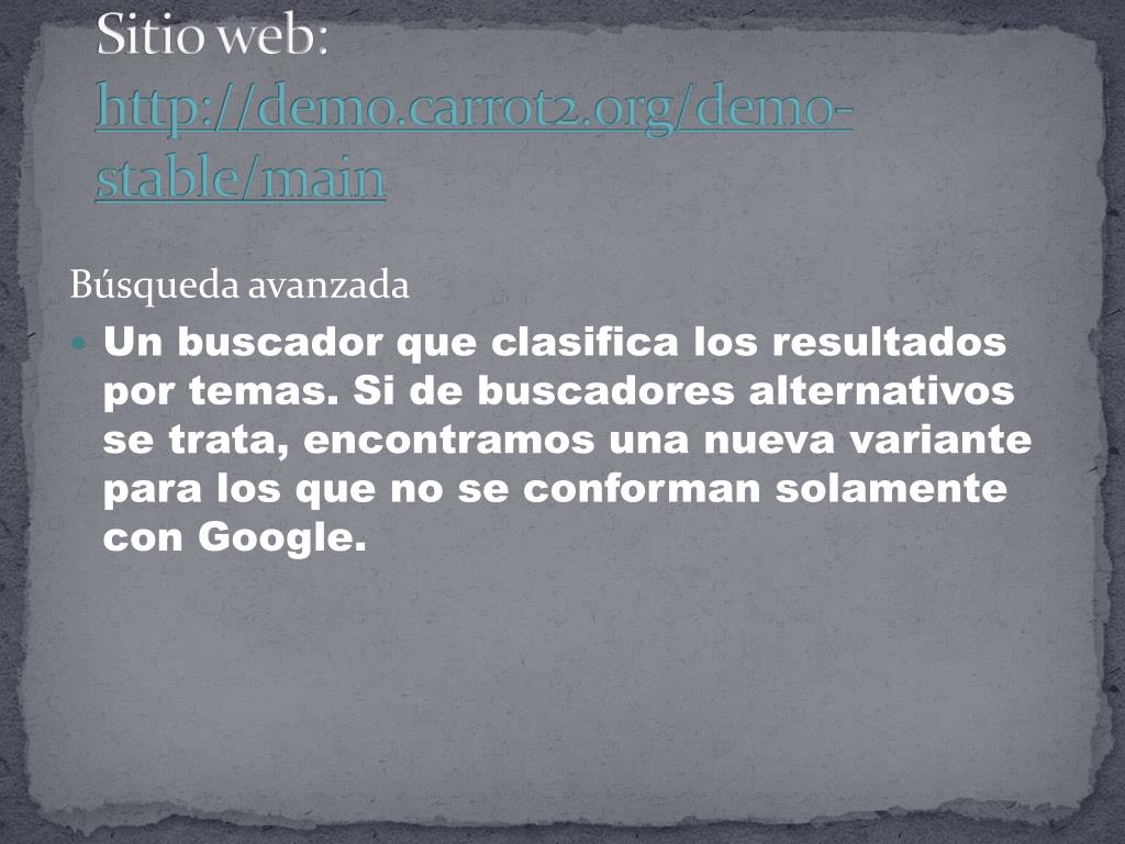 Sitio web: http://demo.carrot2.org/demo-stable/main Búsqueda avanzada • Un buscador que clasifica los resultados por temas. Si de buscadores alternativos se trata, encontramos una nueva variante para los que no se conforman solamente con Google.
