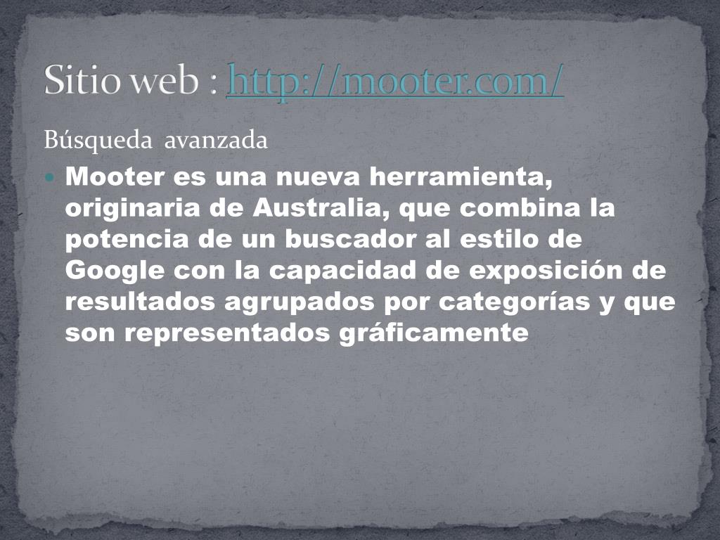 Sitio web : http://mooter.com/ Búsqueda avanzada • Mooter es una nueva herramienta, originaria de Australia, que combina la potencia de un buscador al estilo de Google con la capacidad de exposición de resultados agrupados por categorías y que son representados gráficamente