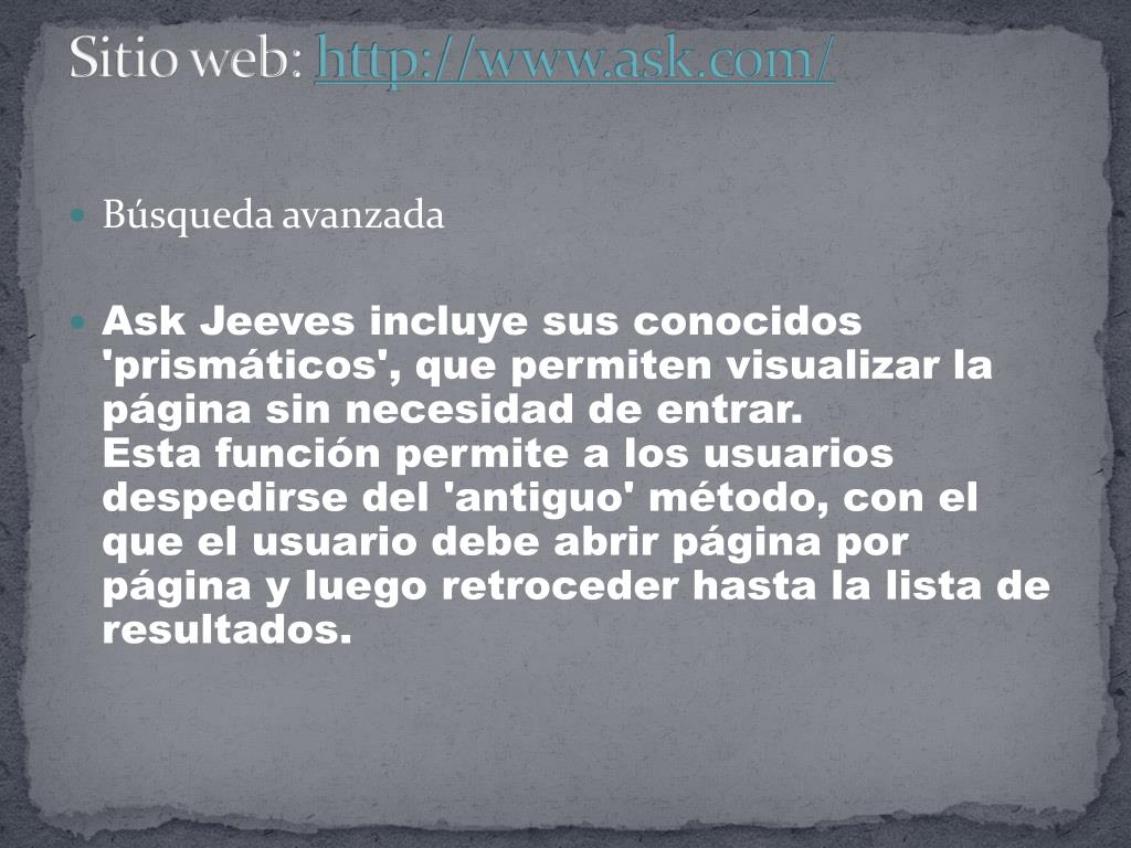 Sitio web: http://www.ask.com/ • Búsqueda avanzada • Ask Jeeves incluye sus conocidos 'prismáticos', que permiten visualizar la página sin necesidad de entrar.Esta función permite a los usuarios despedirse del 'antiguo' método, con el que el usuario debe abrir página por página y luego retroceder hasta la lista de resultados.