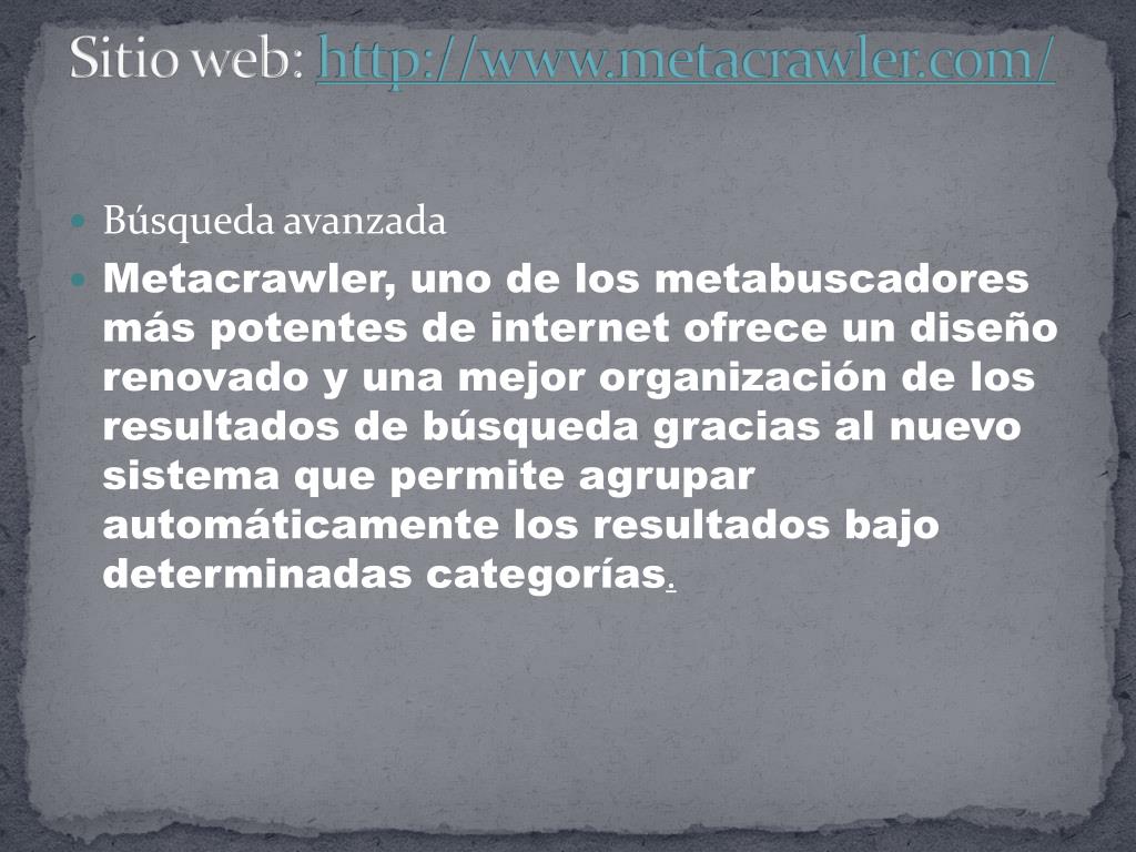 Sitio web: http://www.metacrawler.com/ • Búsqueda avanzada • Metacrawler, uno de los metabuscadores más potentes de internet ofrece un diseño renovado y una mejor organización de los resultados de búsqueda gracias al nuevo sistema que permite agrupar automáticamente los resultados bajo determinadas categorías.
