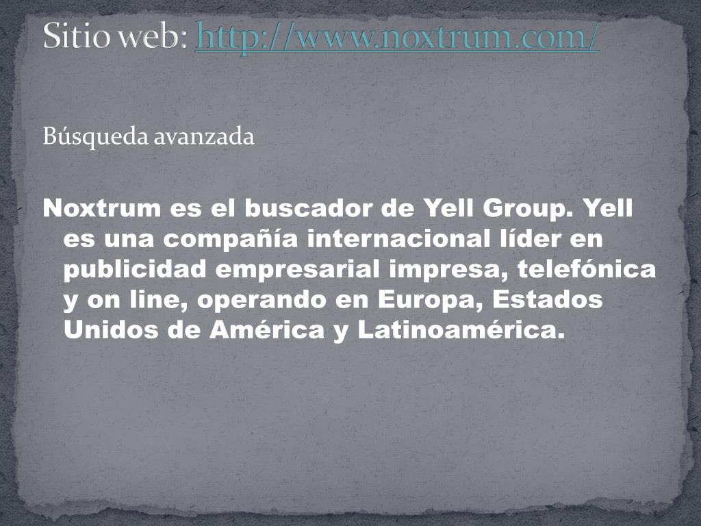 Sitio web: http://www.noxtrum.com/ Búsqueda avanzada Noxtrum es el buscador de Yell Group. Yell es una compañía internacional líder en publicidad empresarial impresa, telefónica y on line, operando en Europa, Estados Unidos de América y Latinoamérica.