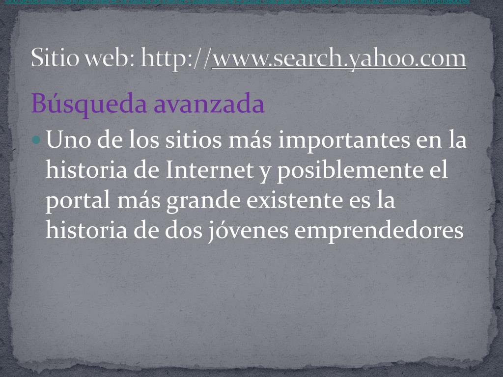Uno de los sitios más importantes en la historia de Internet y posiblemente el portal más grande existente es la historia de dos jóvenes emprendedores Uno de los sitios más importantes en la historia de Internet y posiblemente el portal más grande existente es la historia de dos jóvenes emprendedores Sitio web: http://www.search.yahoo.com Búsqueda avanzada • Uno de los sitios más importantes en la historia de Internet y posiblemente el portal más grande existente es la historia de dos jóvenes emprendedores