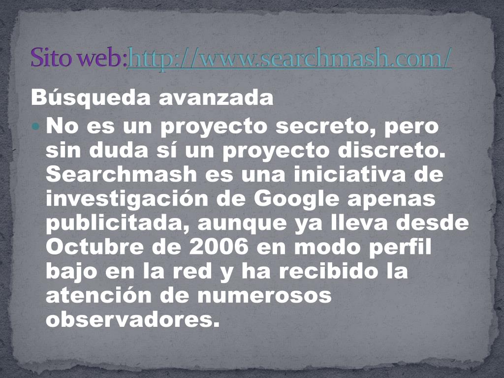 Sito web:http://www.searchmash.com/ Búsqueda avanzada • No es un proyecto secreto, pero sin duda sí un proyecto discreto. Searchmash es una iniciativa de investigación de Google apenas publicitada, aunque ya lleva desde Octubre de 2006 en modo perfil bajo en la red y ha recibido la atención de numerosos observadores.