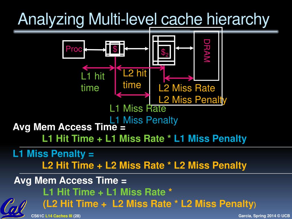L2 hit time L2 Miss Rate L2 Miss Penalty Analyzing Multi-level cache hierarchy DRAM Proc $ $2 L1 hit time L1 Miss Rate L1 Miss Penalty AvgMem Access Time= L1 Hit Time + L1 Miss Rate * L1 Miss Penalty L1 Miss Penalty = L2 Hit Time + L2 Miss Rate * L2 Miss Penalty AvgMem Access Time= L1 Hit Time + L1 Miss Rate*(L2 Hit Time + L2 Miss Rate * L2 Miss Penalty)