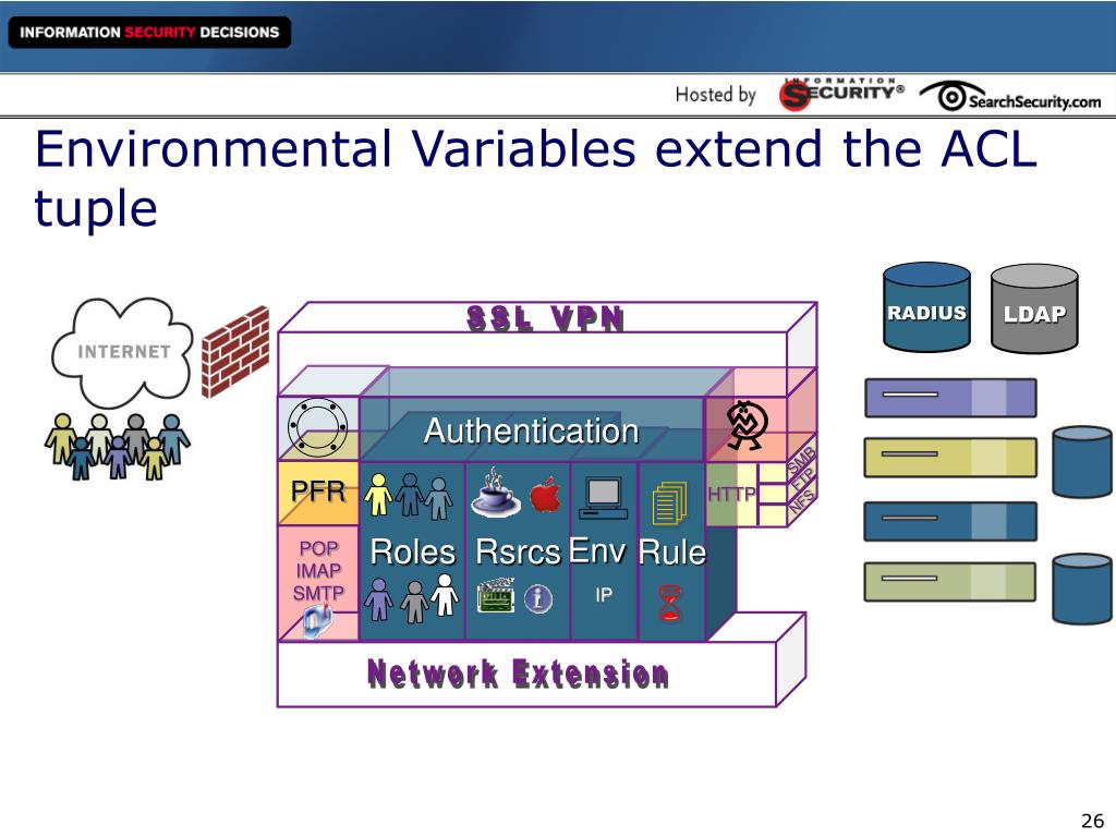 SSL VPN Roles Rsrcs Rule SMB FTP HTTP NFS RADIUS POPIMAPSMTP LDAP Network Extension Environmental Variables extend the ACL tuple Authentication Env PFR IP