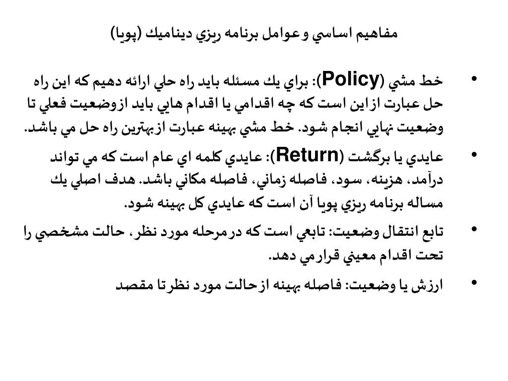 مفاهيم اساسي و عوامل برنامه ريزي ديناميك (پويا) • خط مشي (Policy): براي يك مسئله بايد راه حلي ارائه دهيم كه اين راه حل عبارت از اين است كه چه اقدامي يا اقدام هايي بايد از وضعيت فعلي تا وضعيت نهايي انجام شود. خط مشي بهينه عبارت از بهترين راه حل مي باشد. • عايدي يا برگشت (Return): عايدي كلمه اي عام است كه مي تواند درآمد، هزينه، سود، فاصله زماني، فاصله مكاني باشد. هدف اصلي يك مساله برنامه ريزي پويا آن است كه عايدي كل بهينه شود. • تابع انتقال وضعيت: تابعي است كه در مرحله مورد نظر، حالت مشخصي را تحت اقدام معيني قرار مي دهد. • ارزش يا وضعيت: فاصله بهينه از حالت مورد نظر تا مقصد
