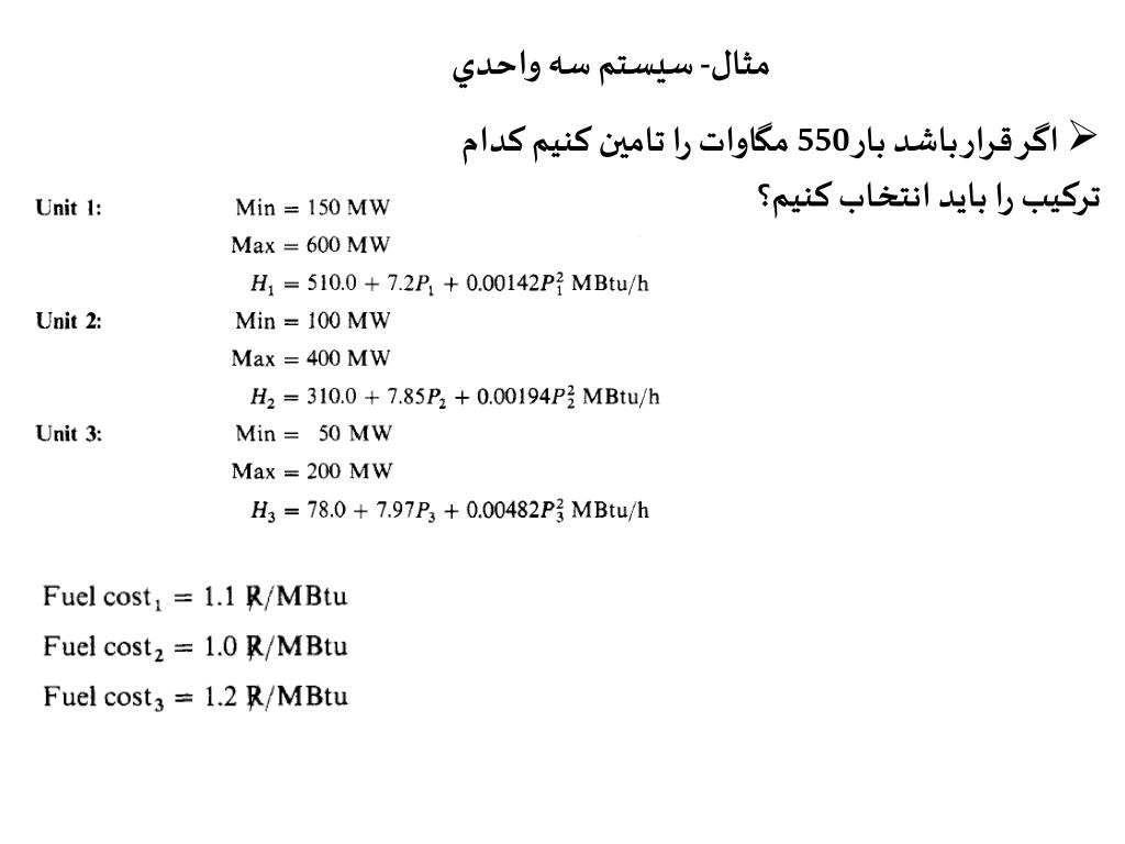 مثال- سيستم سه واحدي • اگر قرار باشد بار 550 مگاوات را تامين كنيم كدام تركيب را بايد انتخاب كنيم؟