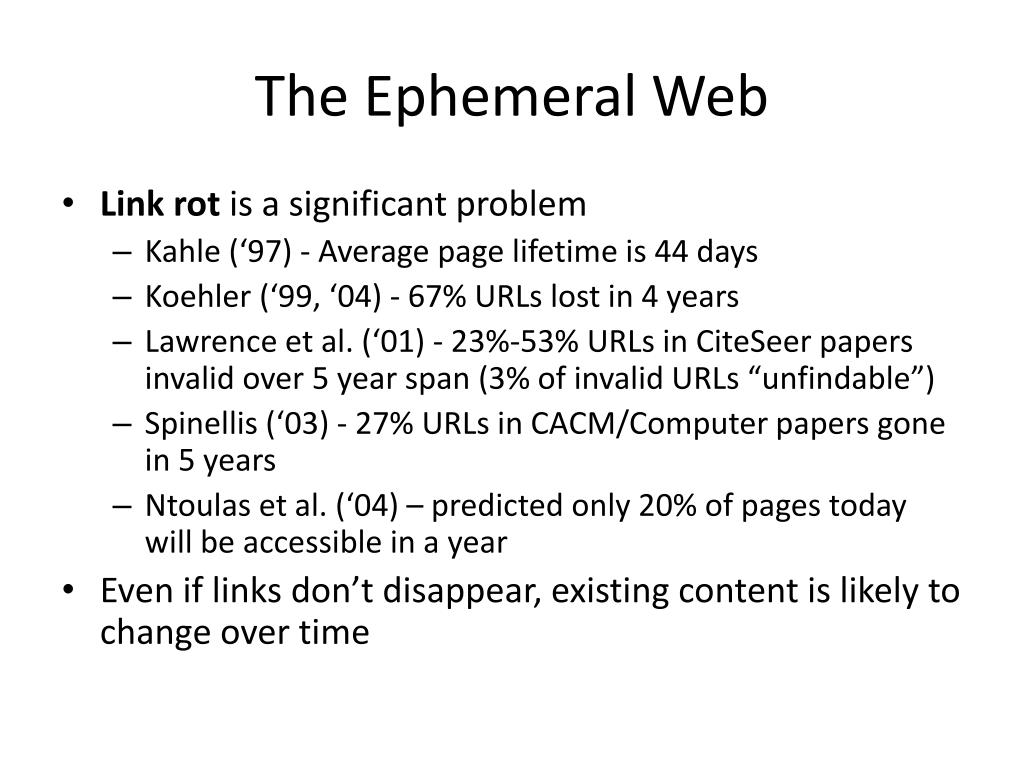 The Ephemeral Web • Link rot is a significant problem • Kahle (‘97) - Average page lifetime is 44 days • Koehler (‘99, ‘04) - 67% URLs lost in 4 years • Lawrence et al. (‘01) - 23%-53% URLs in CiteSeer papers invalid over 5 year span (3% of invalid URLs “unfindable”) • Spinellis (‘03) - 27% URLs in CACM/Computer papers gone in 5 years • Ntoulas et al. (‘04) – predicted only 20% of pages today will be accessible in a year • Even if links don’t disappear, existing content is likely to change over time