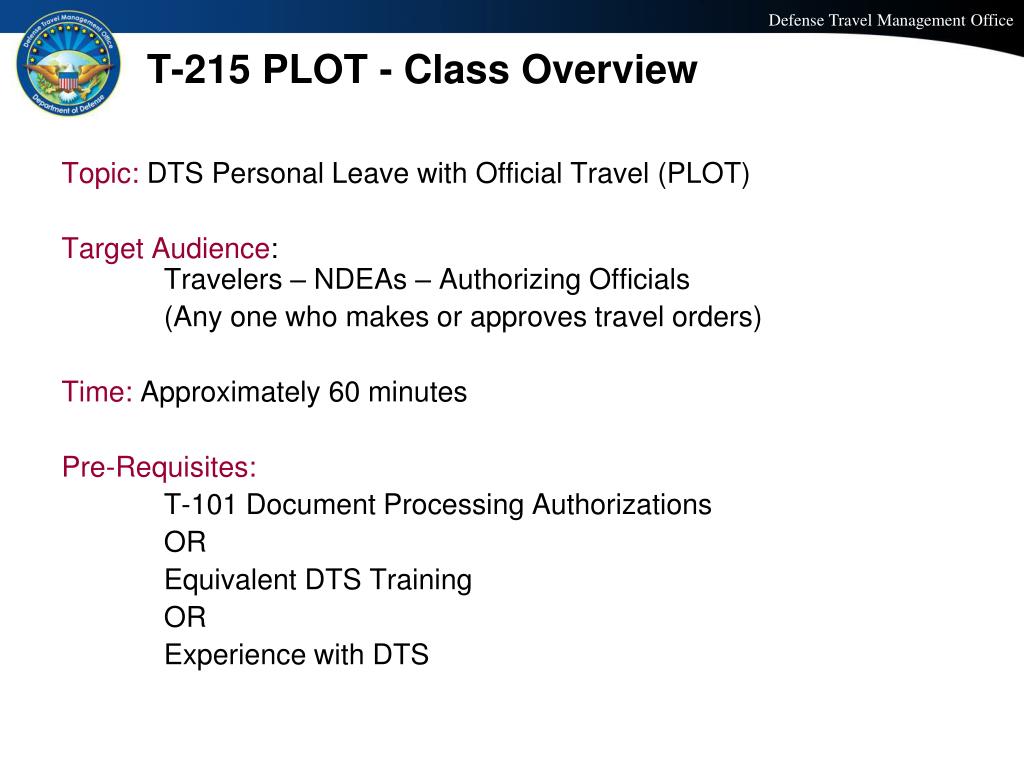 WELCOME TO T-215 Personal Leave with Official Travel (PLOT). T-215 PLOT - Class Overview. Topic: DTS Personal Leave with Official Travel (PLOT) Target Audience : Travelers – NDEAs – Authorizing Officials (Any one who makes or approves travel orders) Time: Approximately 60 minutes