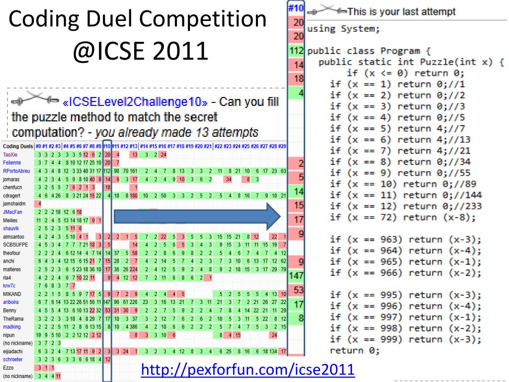 Coding Duel Competition@ICSE 2011 http://pexforfun.com/icse2011