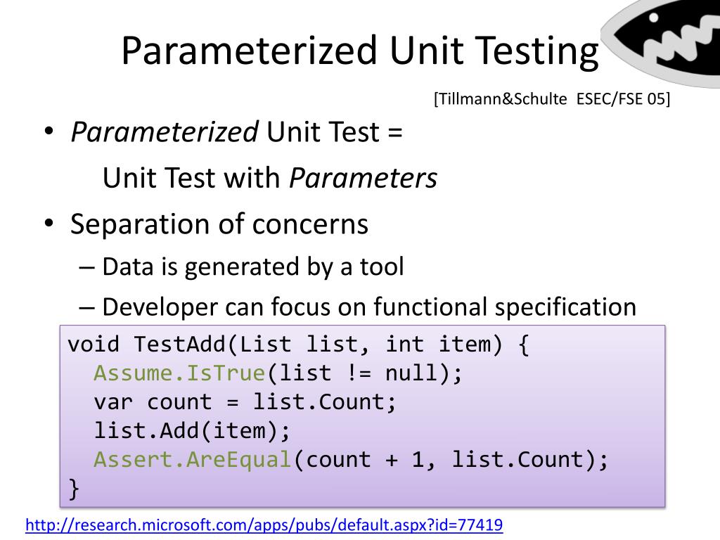 Parameterized Unit Testing [Tillmann&Schulte ESEC/FSE 05] • Parameterized Unit Test = Unit Test with Parameters • Separation of concerns • Data is generated by a tool • Developer can focus on functional specification void TestAdd(List list, int item) { Assume.IsTrue(list != null); var count = list.Count; list.Add(item); Assert.AreEqual(count + 1, list.Count); } http://research.microsoft.com/apps/pubs/default.aspx?id=77419