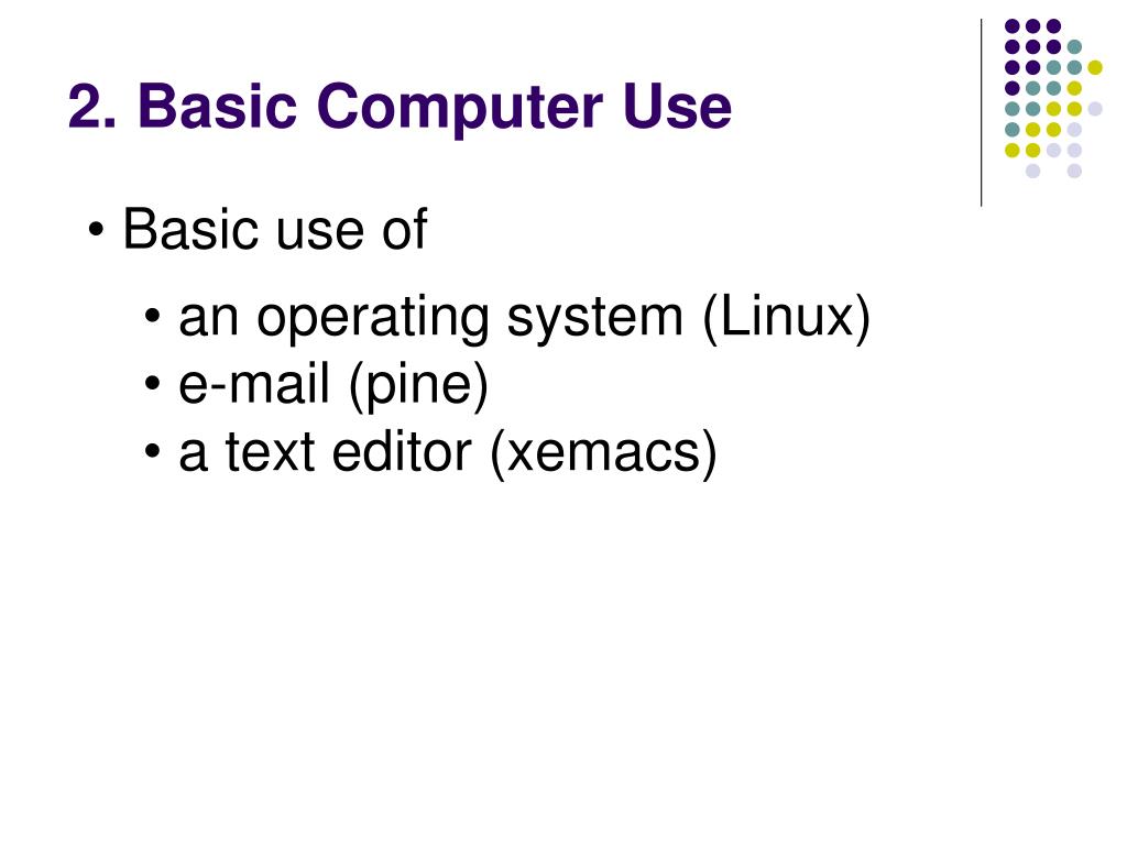 2. Basic Computer Use • Basic use of • an operating system (Linux) • e-mail (pine) • a text editor (xemacs)