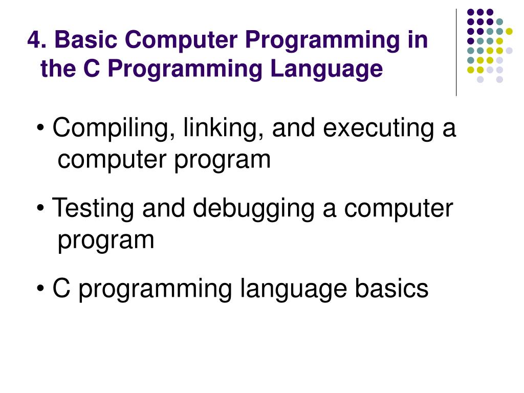 4. Basic Computer Programming in the C Programming Language • Compiling, linking, and executing a computer program • Testing and debugging a computer program • C programming language basics