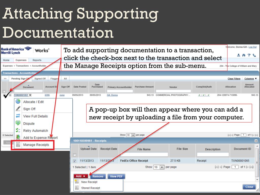 Attaching Supporting Documentation To add supporting documentation to a transaction, click the check-box next to the transaction and select the Manage Receipts option from the sub-menu. A pop-up box will then appear where you can add a new receipt by uploading a file from your computer.