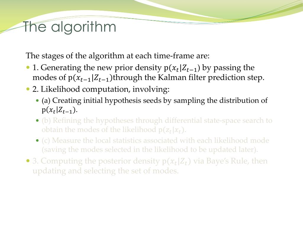 The algorithm The stages of the algorithm at each time-frame are: • 1. Generating the new prior density ) by passing the modes of through the Kalman filter prediction step. • 2. Likelihood computation, involving: • (a) Creating initial hypothesis seeds by sampling the distribution of . • (b) Refining the hypotheses through differential state-space search to obtain the modes of the likelihood . • (c) Measure the local statistics associated with each likelihood mode (saving the modes selected in the likelihood to be updated later). • 3. Computing the posterior density via Baye’s Rule, then updating and selecting the set of modes.