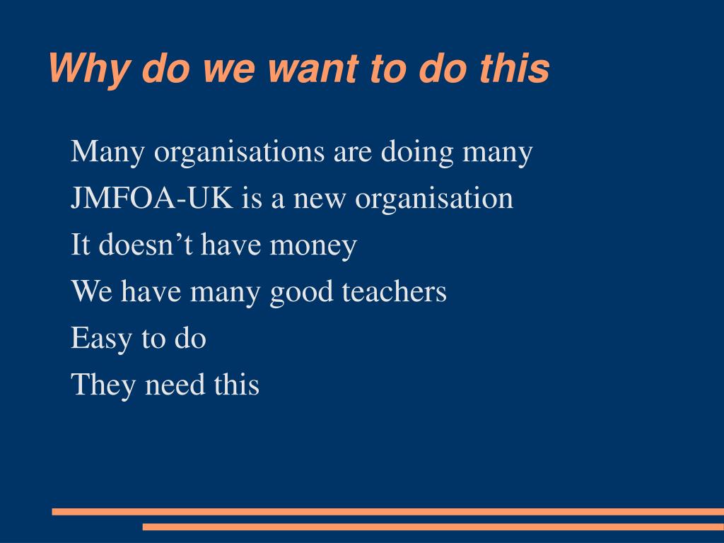 Why do we want to do this Many organisations are doing many JMFOA-UK is a new organisation It doesn’t have money We have many good teachers Easy to do They need this