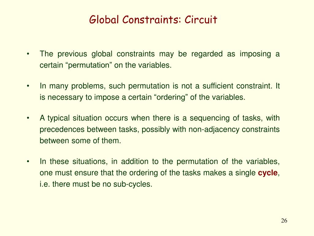 Global Constraints: Circuit • The previous global constraints may be regarded as imposing a certain “permutation” on the variables. • In many problems, such permutation is not a sufficient constraint. It is necessary to impose a certain “ordering” of the variables. • A typical situation occurs when there is a sequencing of tasks, with precedences between tasks, possibly with non-adjacency constraints between some of them. • In these situations, in addition to the permutation of the variables, one must ensure that the ordering of the tasks makes a single cycle, i.e. there must be no sub-cycles.