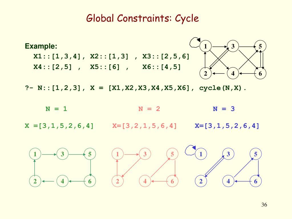 3 1 5 4 2 6 3 3 1 5 1 5 3 1 5 4 4 2 6 2 6 4 2 6 Global Constraints: Cycle Example: X1::[1,3,4], X2::[1,3] , X3::[2,5,6] X4::[2,5] , X5::[6] , X6::[4,5] ?- N::[1,2,3], X = [X1,X2,X3,X4,X5,X6], cycle(N,X). N = 1N = 2N = 3 X =[3,1,5,2,6,4]X=[3,2,1,5,6,4]X=[3,1,5,2,6,4]