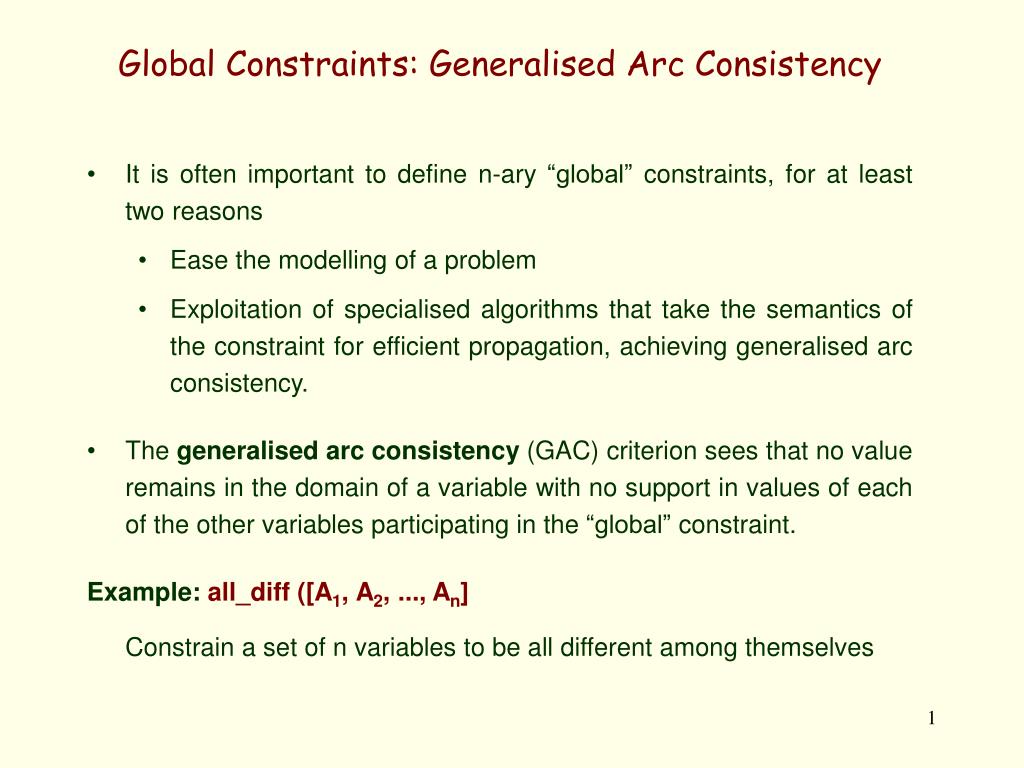 Global Constraints: Generalised Arc Consistency. It is often important to define n-ary “global” constraints, for at least two reasons Ease the modelling of a problem
