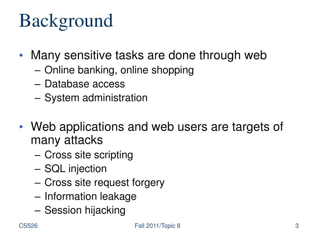 Background • Many sensitive tasks are done through web • Online banking, online shopping • Database access • System administration • Web applications and web users are targets of many attacks • Cross site scripting • SQL injection • Cross site request forgery • Information leakage • Session hijacking Fall 2011/Topic 8