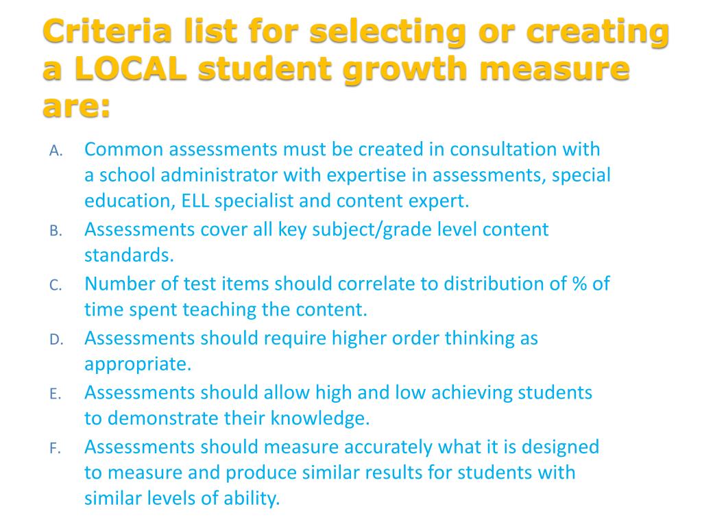 Common assessments must be created in consultation with a school administrator with expertise in assessments, special education, ELL specialist and content expert. • Assessments cover all key subject/grade level content standards. • Number of test items should correlate to distribution of % of time spent teaching the content. • Assessments should require higher order thinking as appropriate. • Assessments should allow high and low achieving students to demonstrate their knowledge. • Assessments should measure accurately what it is designed to measure and produce similar results for students with similar levels of ability. Criteria list for selecting or creating a LOCAL student growth measure are: