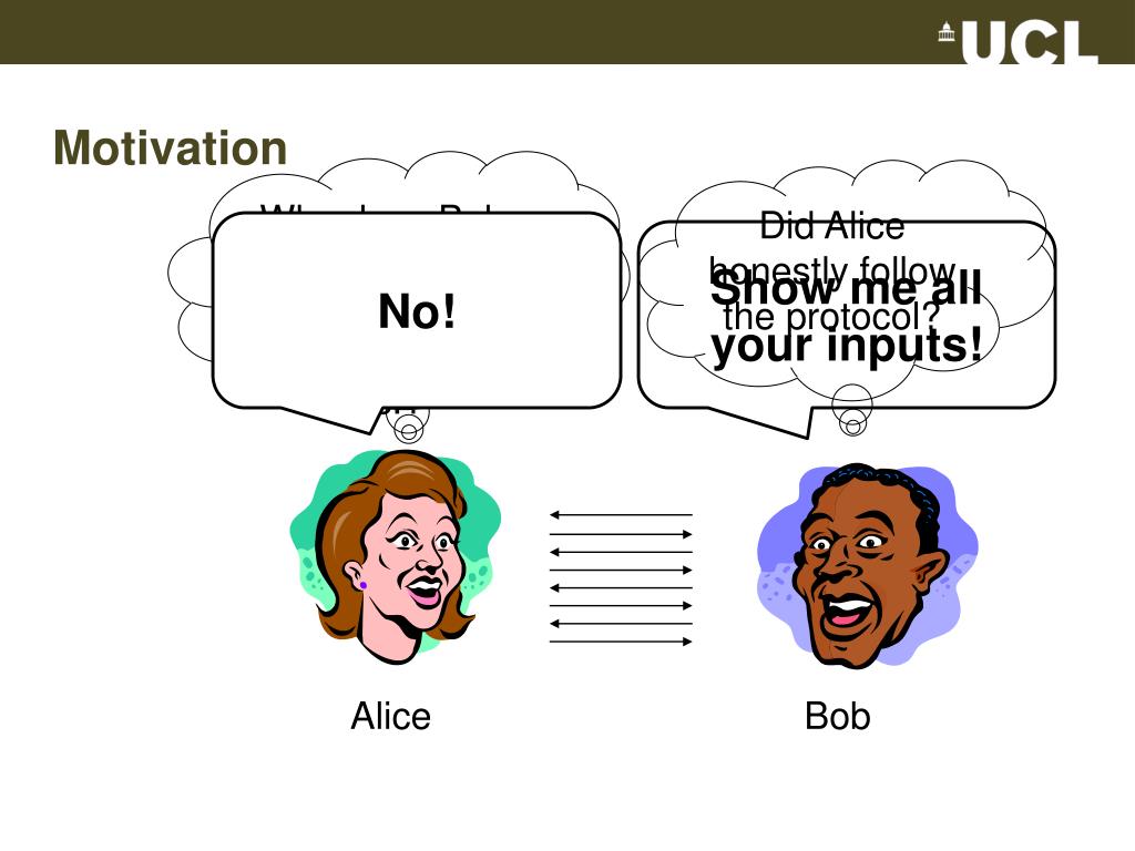 Motivation Why does Bob want to know my password, bank statement, etc.? Did Alice honestly follow the protocol? No! Show me all your inputs! Alice Bob