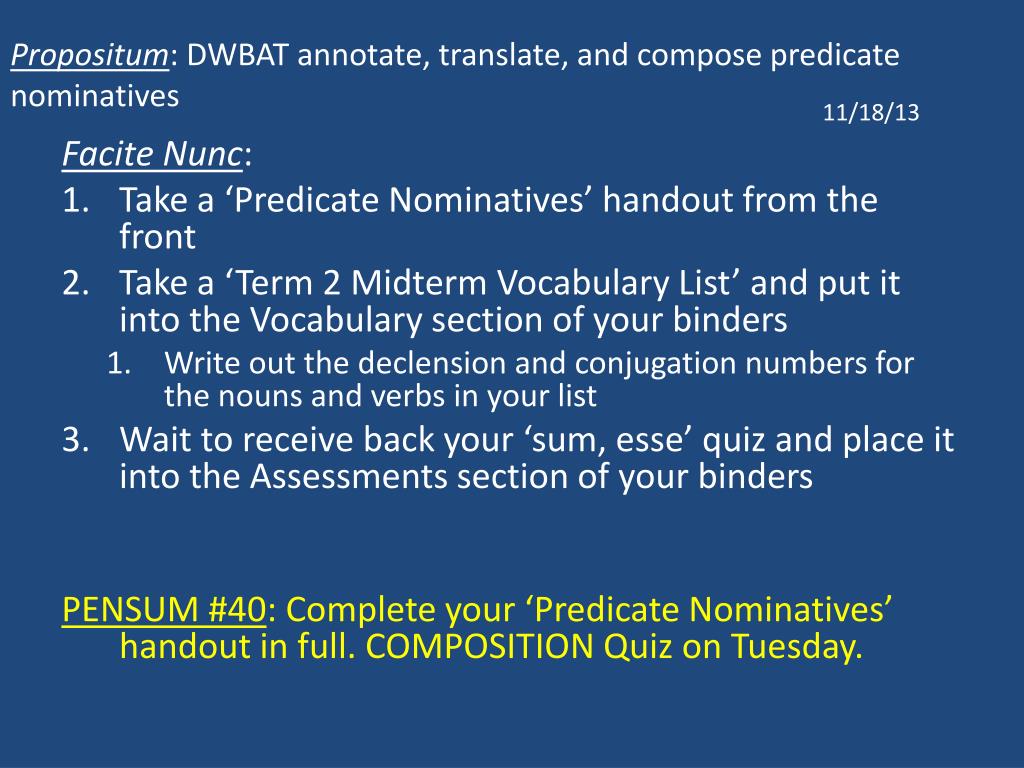 Propositum: DWBAT annotate, translate, and compose predicate nominatives 11/18/13 FaciteNunc: • Take a ‘Predicate Nominatives’ handout from the front • Take a ‘Term 2 Midterm Vocabulary List’ and put it into the Vocabulary section of your binders • Write out the declension and conjugation numbers for the nouns and verbs in your list • Wait to receive back your ‘sum, esse’ quiz and place it into the Assessments section of your binders PENSUM #40: Complete your ‘Predicate Nominatives’ handout in full. COMPOSITION Quiz on Tuesday.