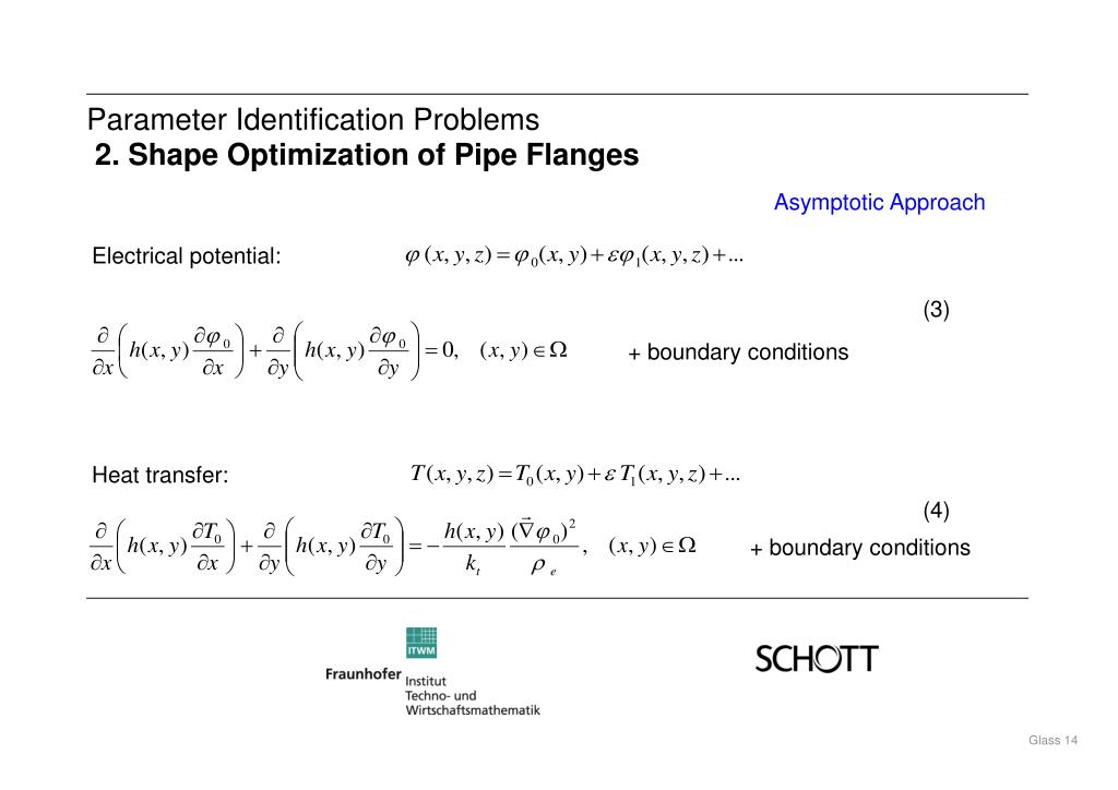 Electrical potential: + boundary conditions Heat transfer: + boundary conditions Parameter Identification Problems 2. Shape Optimization of Pipe Flanges Asymptotic Approach (3) (4)
