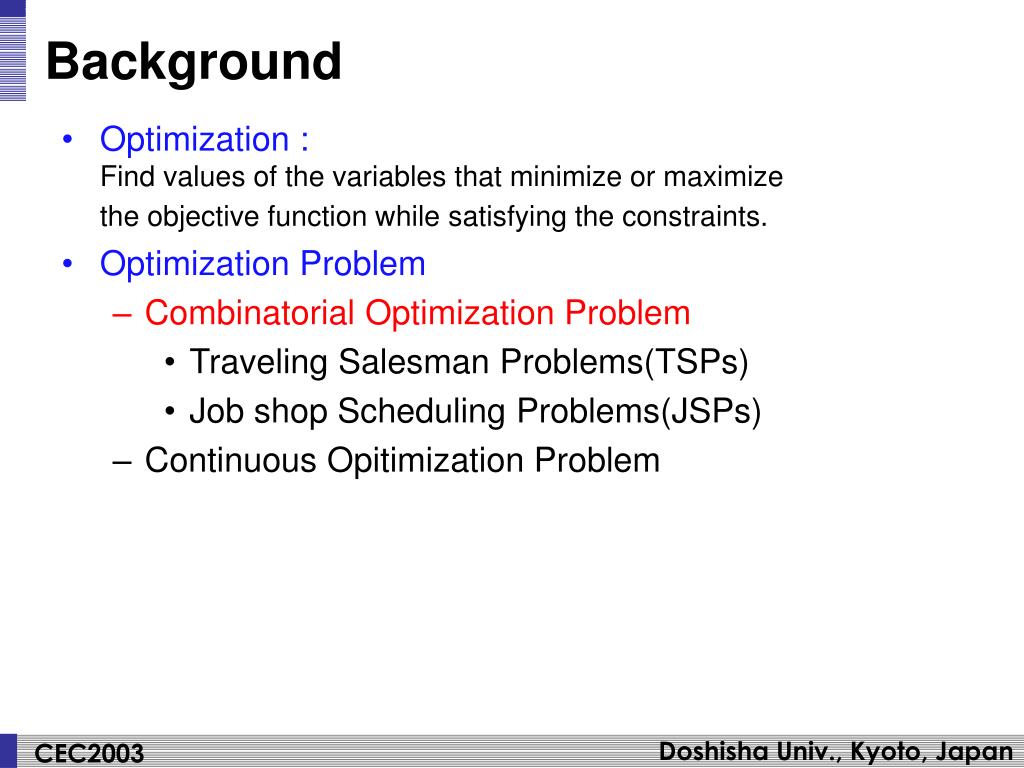 Background • Optimization :Find values of the variables that minimize or maximize the objective function while satisfying the constraints. • Optimization Problem • Combinatorial Optimization Problem • Traveling Salesman Problems(TSPs) • Job shop Scheduling Problems(JSPs) • Continuous Opitimization Problem