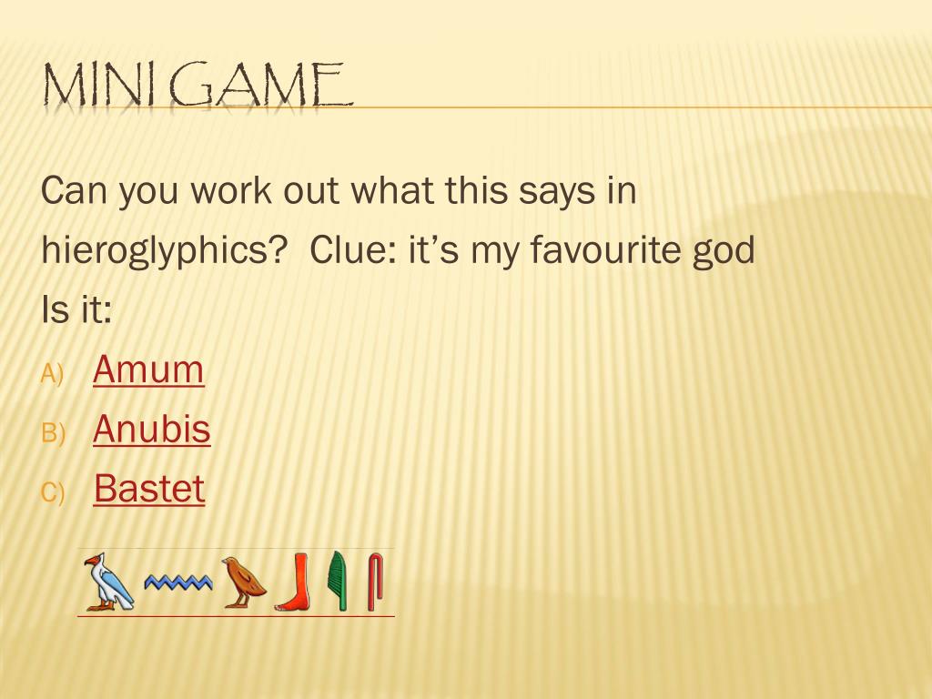 Can you work out what this says in hieroglyphics? Clue: it’s my favourite god Is it: Amum Anubis Bastet MINI GAME