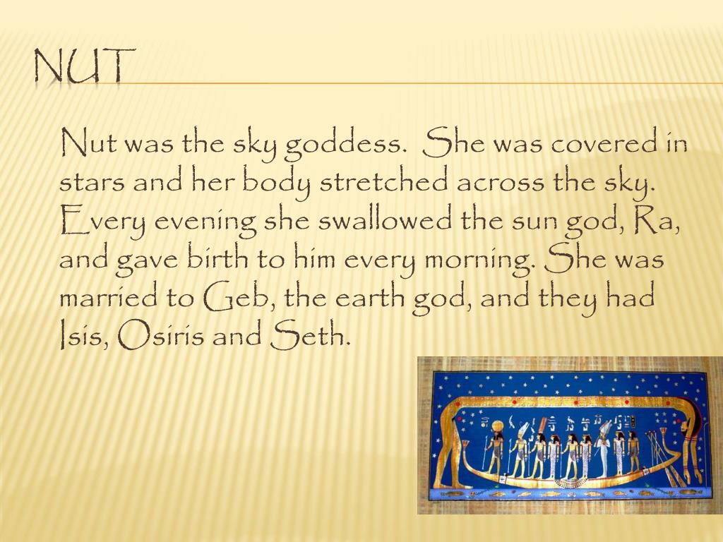 Nut was the sky goddess. She was covered in stars and her body stretched across the sky. Every evening she swallowed the sun god, Ra, and gave birth to him every morning. She was married to Geb, the earth god, and they had Isis, Osiris and Seth. Nut