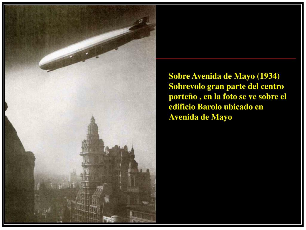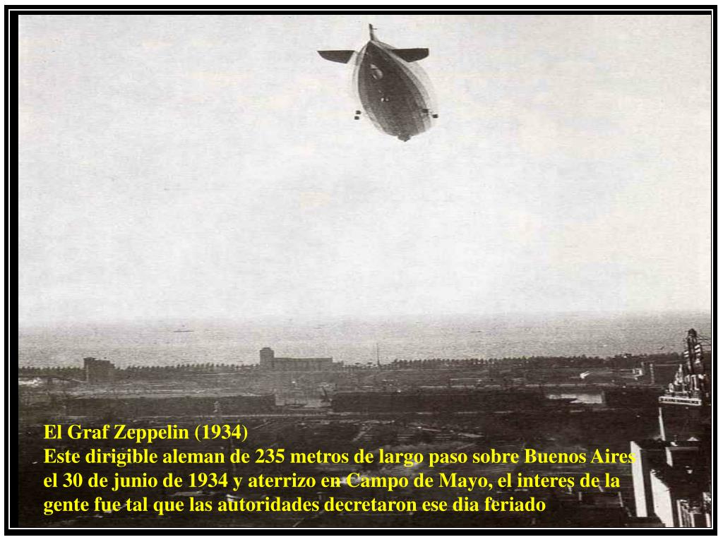 El Graf Zeppelin (1934) Este dirigible aleman de 235 metros de largo paso sobre Buenos Aires el 30 de junio de 1934 y aterrizo en Campo de Mayo, el interes de la gente fue tal que las autoridades decretaron ese dia feriado