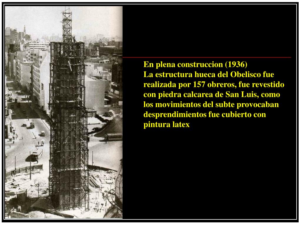 En plena construccion (1936) La estructura hueca del Obelisco fue realizada por 157 obreros, fue revestido con piedra calcarea de San Luis, como los movimientos del subte provocaban desprendimientos fue cubierto con pintura latex