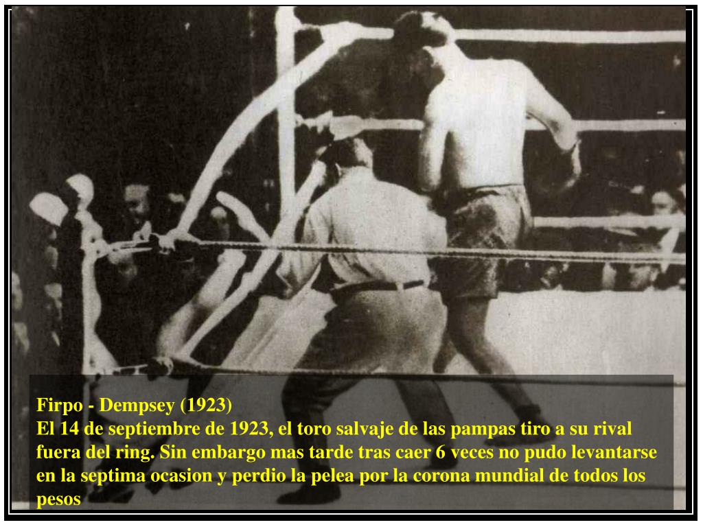Firpo - Dempsey (1923) El 14 de septiembre de 1923, el toro salvaje de las pampas tiro a su rival fuera del ring. Sin embargo mas tarde tras caer 6 veces no pudo levantarse en la septima ocasion y perdio la pelea por la corona mundial de todos los pesos