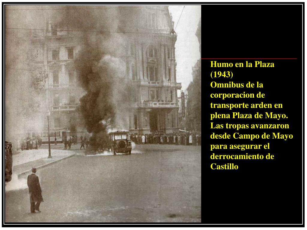 Humo en la Plaza (1943) Omnibus de la corporacion de transporte arden en plena Plaza de Mayo. Las tropas avanzaron desde Campo de Mayo para asegurar el derrocamiento de Castillo
